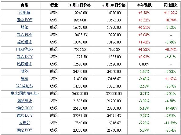 根據(jù)2014年上半年(1.1-6.30)紡織大宗商品價(jià)格漲跌榜數(shù)據(jù)顯示,漲幅較大的是丙烯腈,半年漲幅達(dá)8.73%,同比漲幅11.45%,腈綸在成本帶動(dòng)下位居第二,半年漲幅6.21%。丙烯腈工廠多套裝置的集中檢修后未及時(shí)開工,市場(chǎng)上現(xiàn)貨供應(yīng)緊張,刺激了市場(chǎng)價(jià)格快速上漲。不過隨著廠家恢復(fù)生產(chǎn),同時(shí)下游需求無明顯好轉(zhuǎn)跡象,后市來看行情不樂觀。